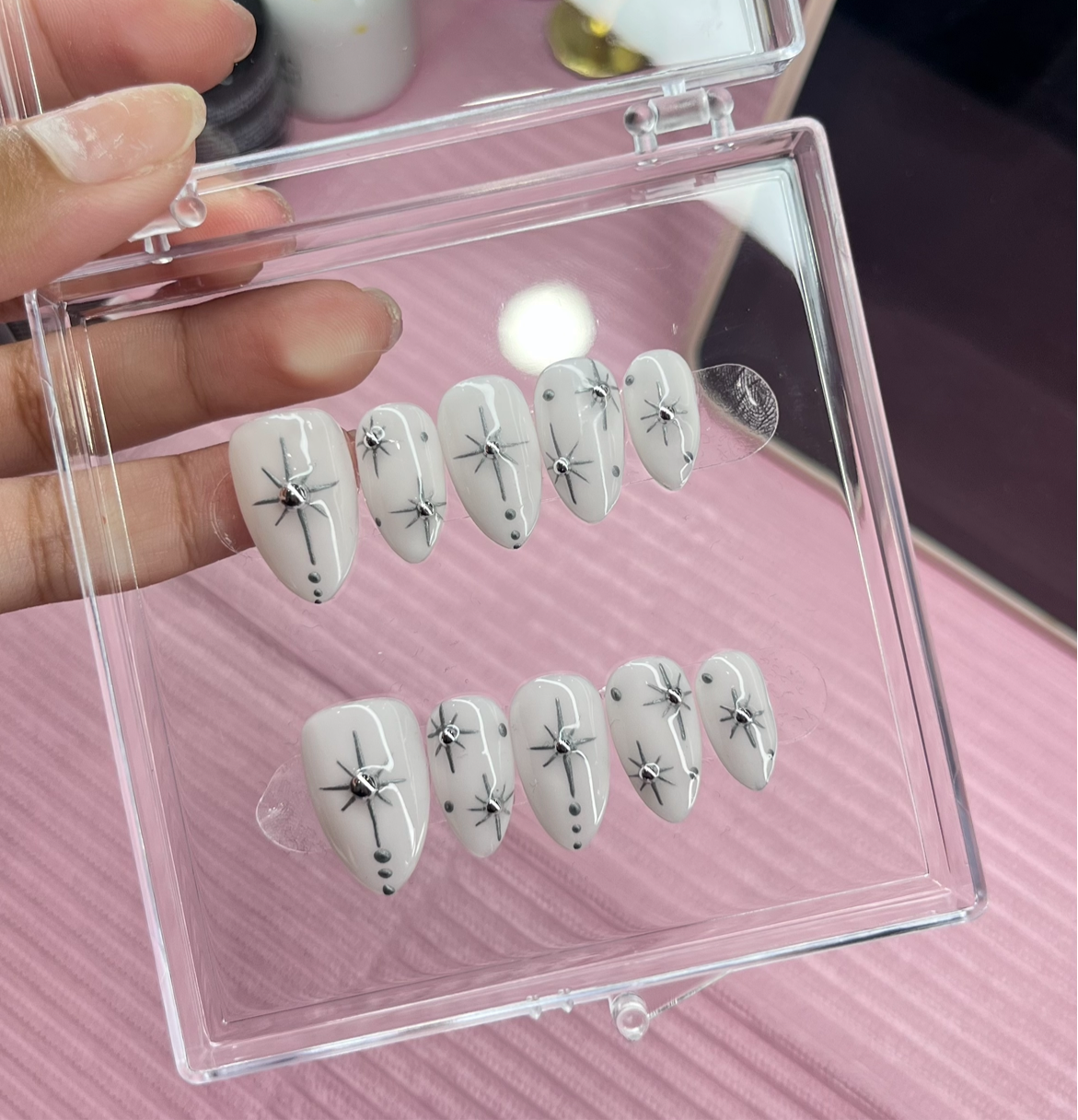 Star Struck is a beautiful nail set hand-painted, making the illusion of getting a fresh set from the nail salon! To order, email a picture of your fingers next to a coin for correct size measurements, put the name on the order as the subject in the email. Send the pictures to ineetmattu@gmail.com or DM to Instagram @_shine_nailsss.