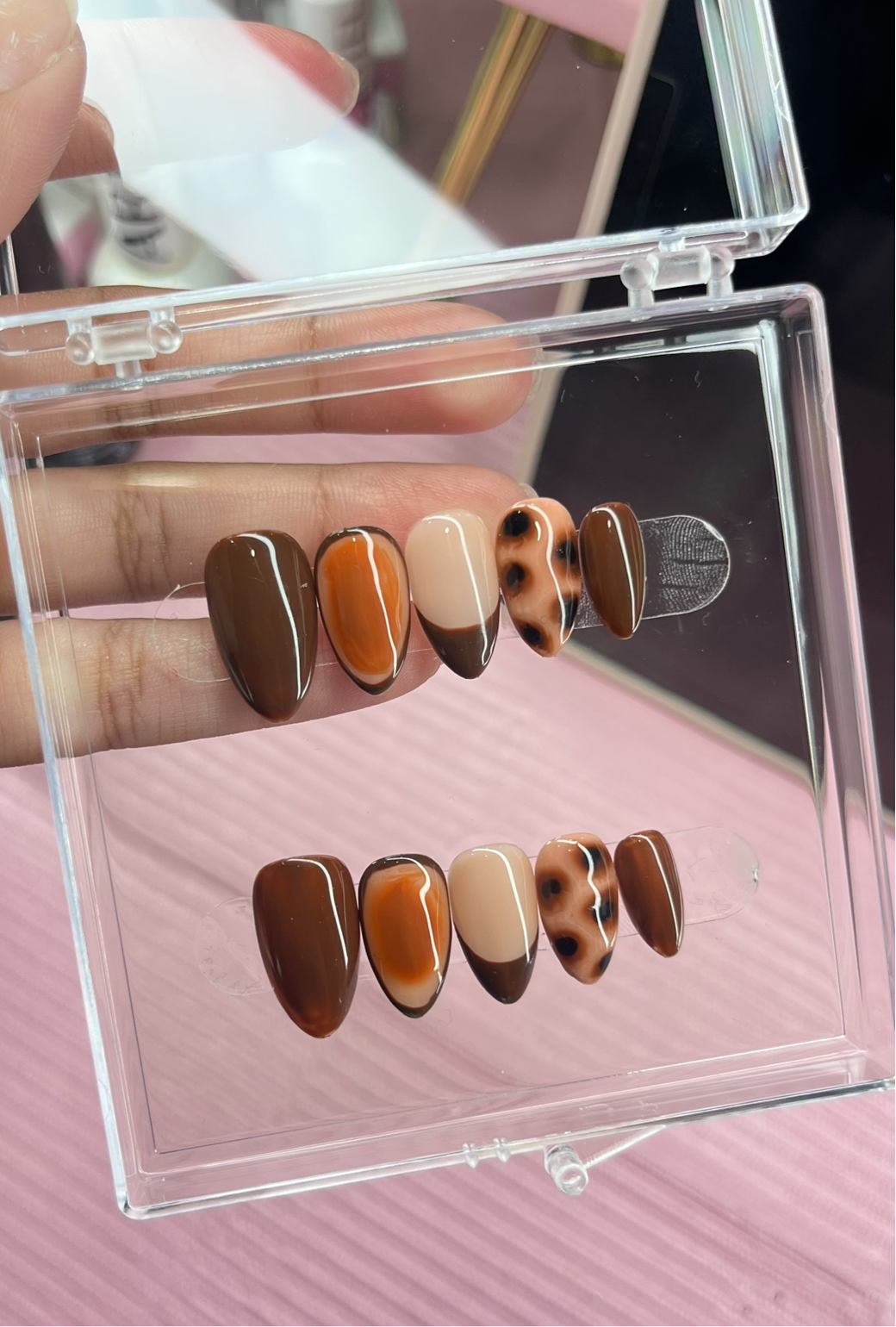 Autumn Tortoise are a beautiful nail set hand-painted, making the illusion of getting a fresh set from the nail salon! To order, email a picture of your fingers next to a coin for correct size measurements, put the name on the order as the subject in the email. Send the pictures to ineetmattu@gmail.com or DM to Instagram @_shine_nailsss.