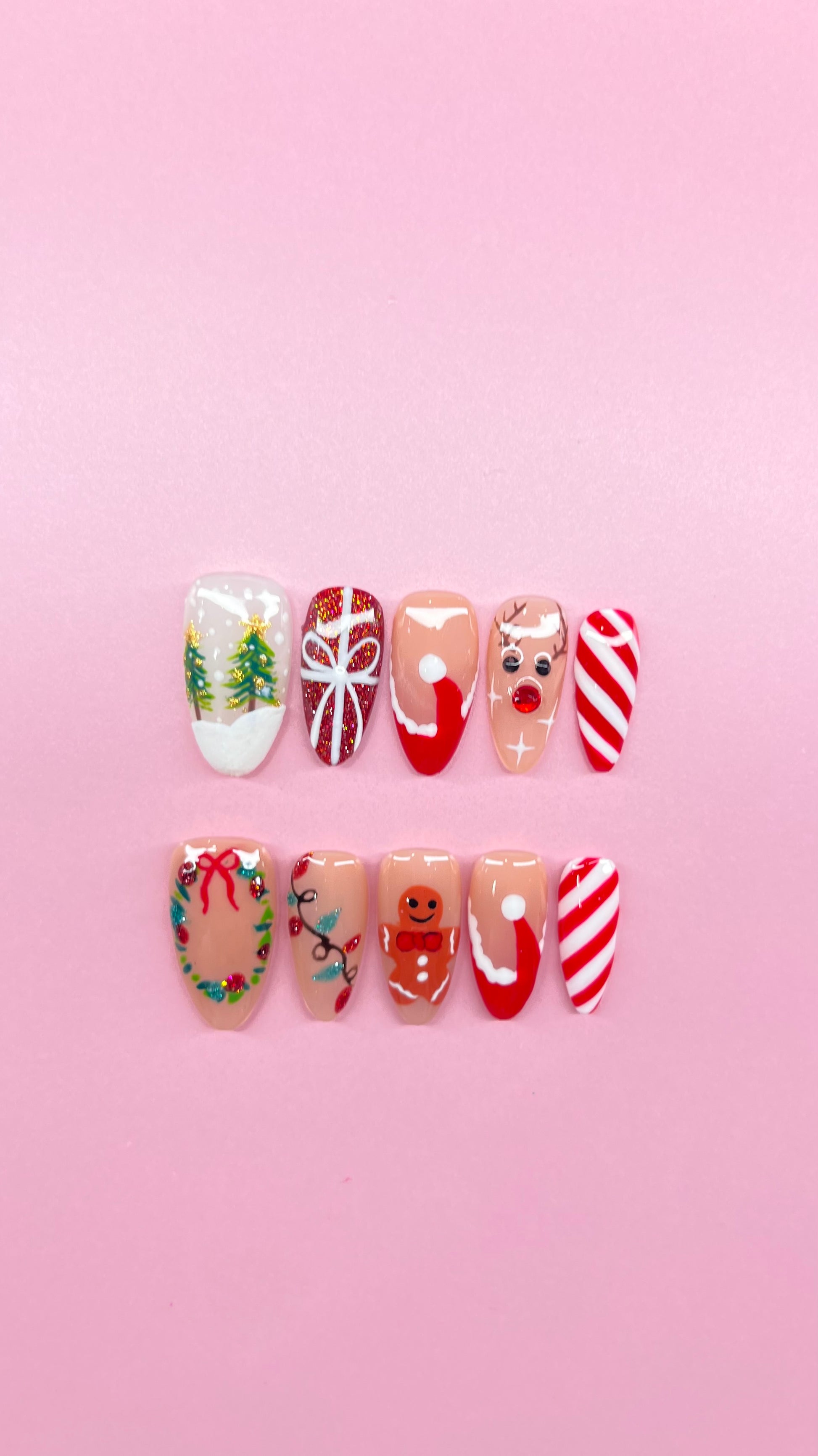 Christmas Wonderland is a beautiful nail set hand-painted, making the illusion of getting a fresh set from the nail salon! To order, email a picture of your fingers next to a coin for correct size measurements, put the name on the order as the subject in the email. Send the pictures to ineetmattu@gmail.com or DM to Instagram @_shine_nailsss.Ll