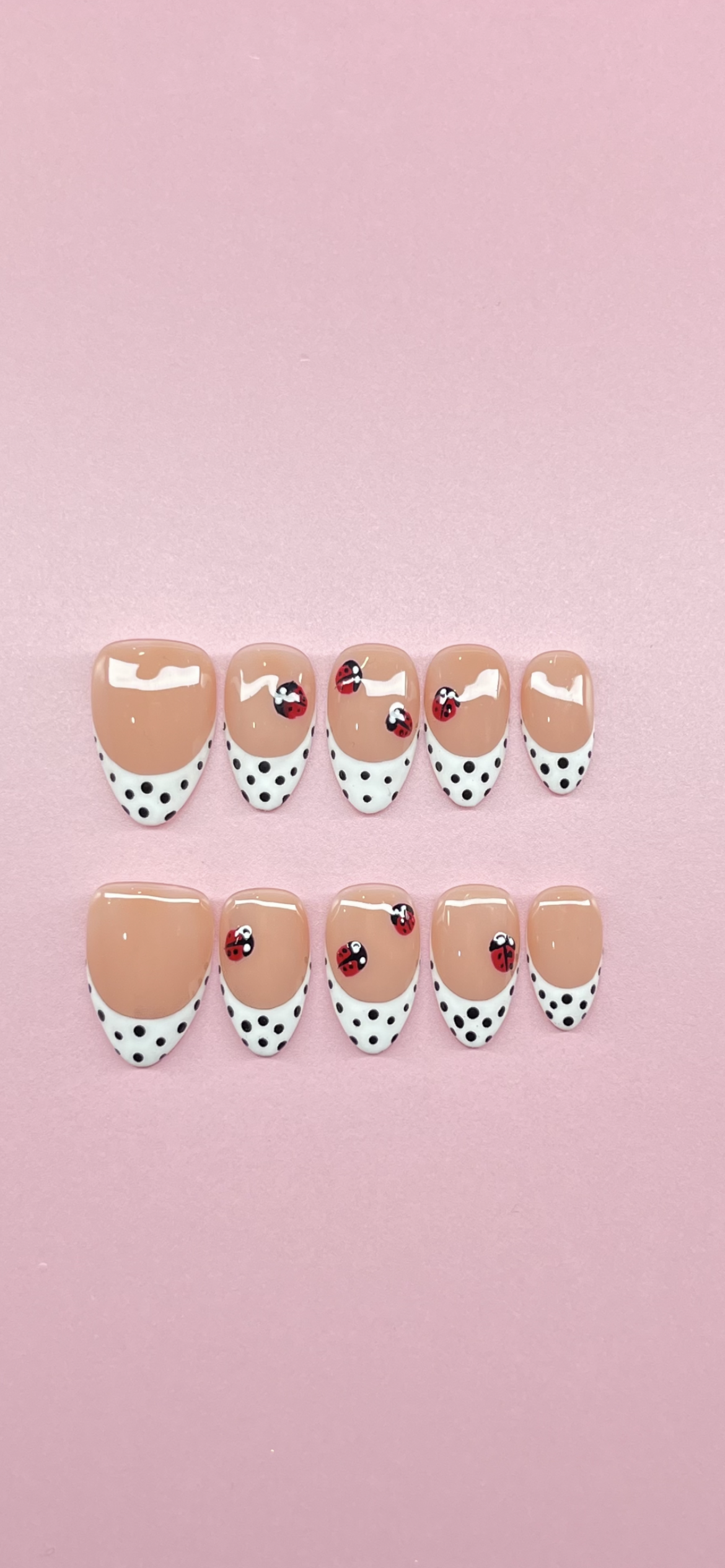 Ladybug Love is a beautiful nail set hand-painted, making the illusion of getting a fresh set from the nail salon! To order, email a picture of your fingers next to a coin for correct size measurements, put the name on the order as the subject in the email. Send the pictures to ineetmattu@gmail.com or DM to Instagram @_shine_nailsss.