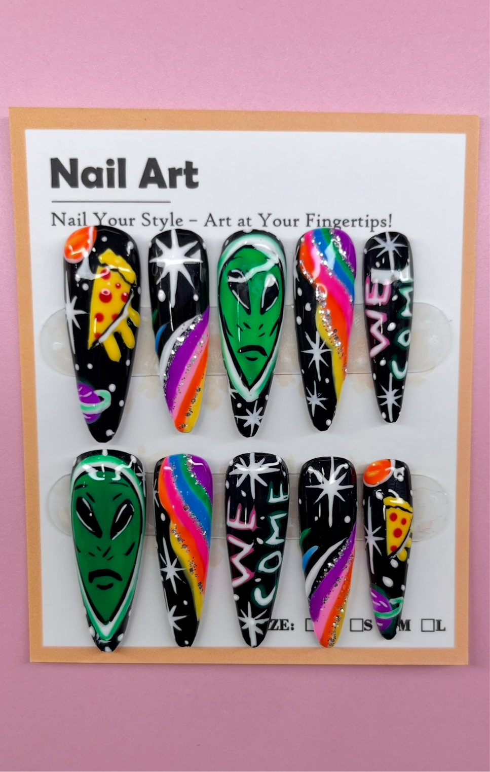 Area 51 is a beautiful nail set hand-painted, making the illusion of getting a fresh set from the nail salon! To order, email a picture of your fingers next to a coin for correct size measurements, put the name on the order as the subject in the email. Send the pictures to ineetmattu@gmail.com or DM to Instagram @_shine_nailsss.Ll