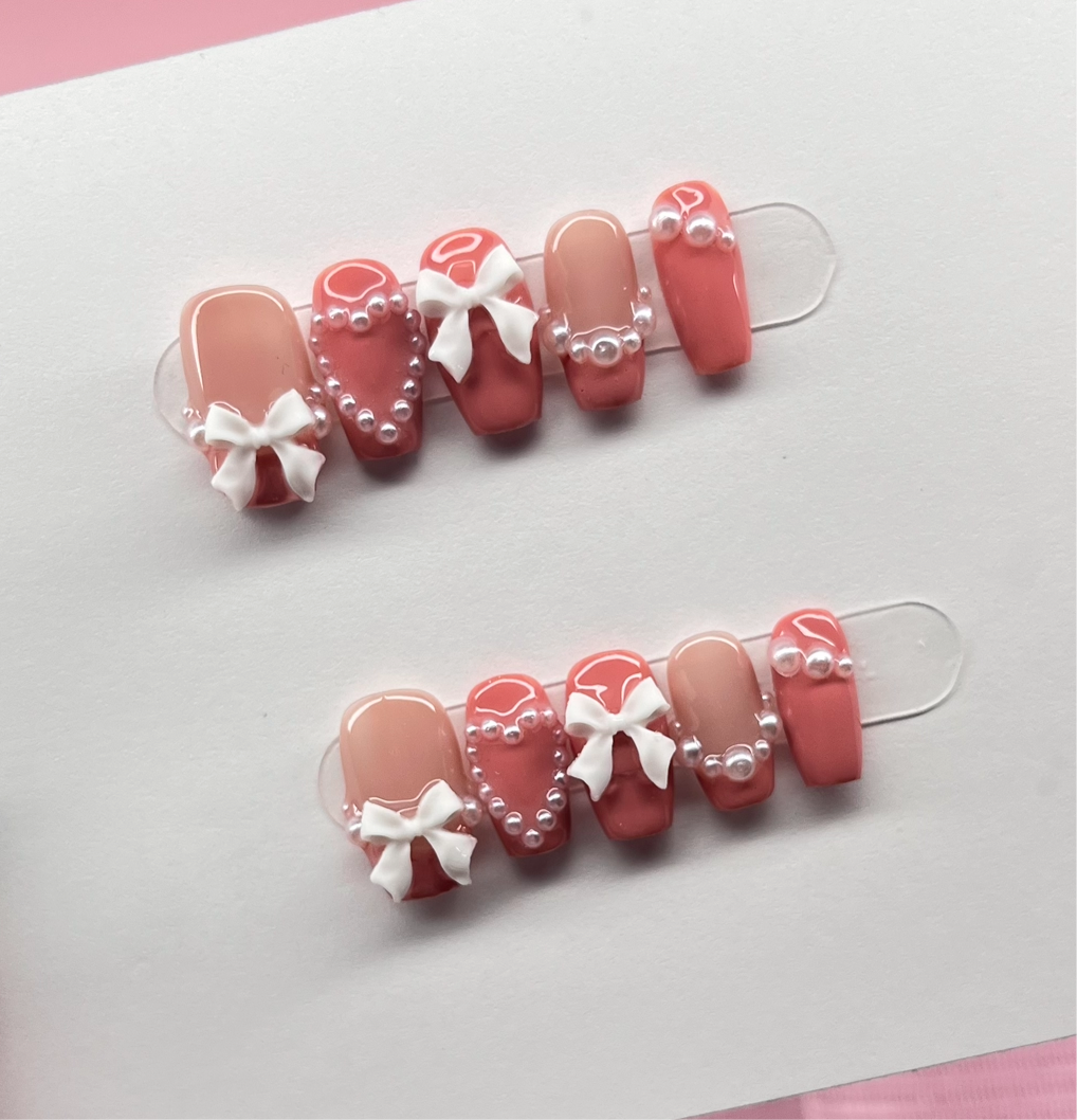 Coquette Love is beautiful nail set hand-painted, making the illusion of getting a fresh set from the nail salon! To order, email a picture of your fingers next to a coin for correct size measurements, put the name on the order as the subject in the email. Send the pictures to ineetmattu@gmail.com or DM to Instagram @_shine_nailsss.