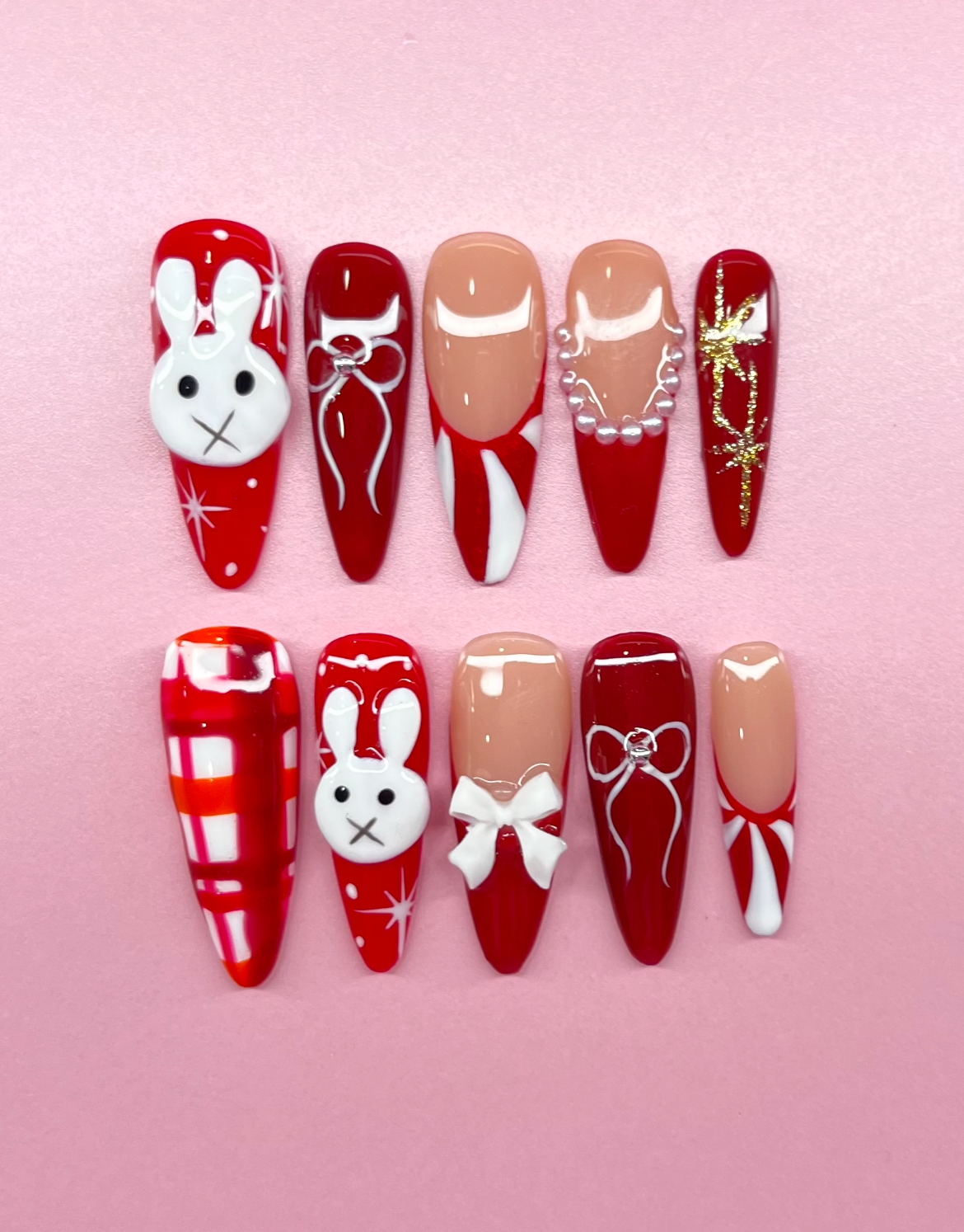Miss Clause is a beautiful nail set hand-painted, making the illusion of getting a fresh set from the nail salon! To order, email a picture of your fingers next to a coin for correct size measurements, put the name on the order as the subject in the email. Send the pictures to ineetmattu@gmail.com or DM to Instagram @_shine_nailsss.